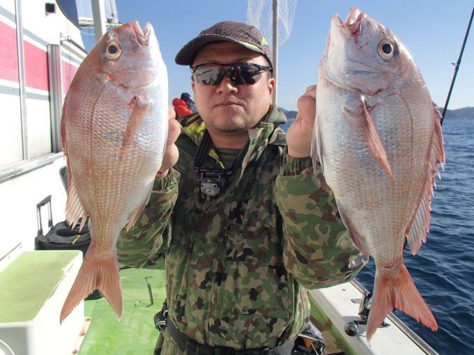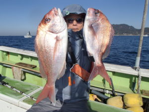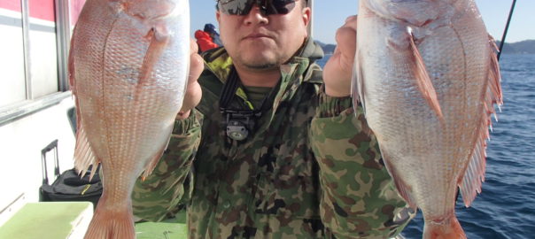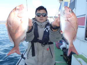 マダイ船 2025年11月30日マダイ, 釣果速報 マダイ前半活発!!!明日はマダイ船とティップランアオリイカ船で受付中ですので皆様のご乗船お待ちしております。 本日の釣果 マダイ 0.6~1.8kg 0~3匹(3匹が3名)0は1人 前半当たりが良かったです!!!朝は勝山沖で顔を見てから移動しました。移動して間もなく当たりが出始めるとバタバタと当たりが出てダブルヒットなどもあり好調でした。中盤以降もポツポツ当たりが出て残念ながらオデコの方が1名でてしまったもののまずまずの釣果となれました。 関連