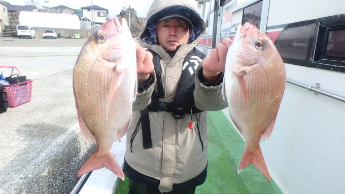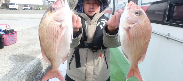 マダイ船 2026年2月8日マダイ, 釣果速報 マダイ前半好調!!!明日もマダイ船で出船しますのでお電話お待ちしております。 本日の釣果 マダイ 0.8~2.5kg 4~4匹 本日雪の中お2人での出船となりました。かなり雪でつらい状況でしたがマダイの活性は高く前半にバタバタと当たりがでて中盤以降もポツポツ当たりが出て好釣果となれました。 関連