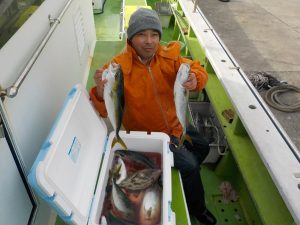 本日3名での出船となりました。朝は勝山沖でイナダとマダイがポツポツ当たり皆さんお土産を確保してから今日は象背根へ移動してみました。到着して程なく当たりだし入れ食い状態に!手巻きの貸し竿の方も1名いましたがコマセの撒き方のコツを掴んでから立て続けに当たり始め後半に潮が速くなってしまいましたが終日食いは好調でした。