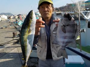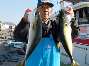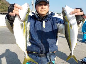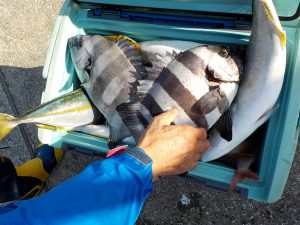 朝のポイントではイナダとマダイの当たりがポツポツあり全員顔を見る事が出来、良い人は両魚で7匹釣る事が出来ました。その後象背根へ移動してからは到着1投目から当たり入れ食いが暫く続きその後食いは落ちたもののポツポツながらも当たり続け後半にも入れ食いタイムがありイナダ釣り初挑戦の方を含め皆さんクーラー満杯となることができました。
