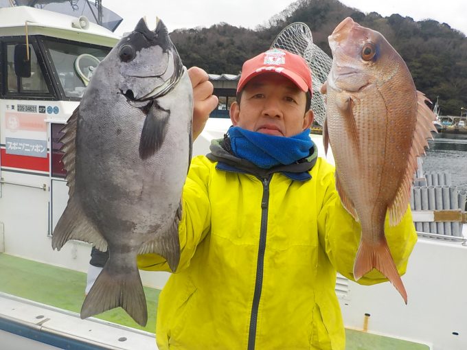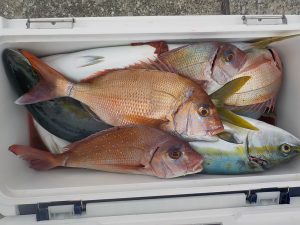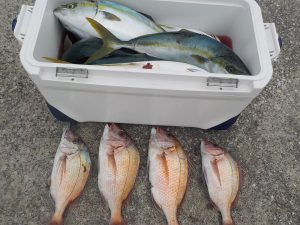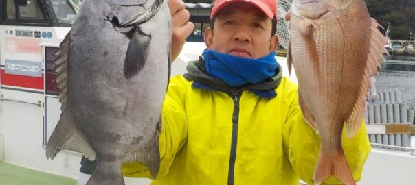 マダイ&イナダ船 2017年1月19日イサキ, 釣果速報イサキ, 勝山, 千葉県 本日の釣果 マダイ 0.3~1.5㎏ 4~5匹 イナダ 1.0~1.8kg 6~8匹 他に1.7㎏イシダイ、アマダイなど 本日3名様での出船となりました。コマセの効きが良くない中頑張って貰え、終日順調な食いがあり象背根に至ってはイナダのトリプルヒットやマダイのダブルヒットなどもあり中弛み的な事もなく皆さん楽しめた様です。 関連