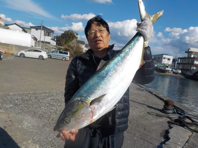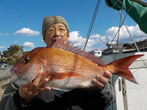 到着して間もなく大きな当たりでハリスが4号との事だったので慎重にやり取りをしてもらい約1時間かかりはしたものの13.2㎏のブリをゲットできました。その後は潮が動かずマアジがポツンポツンとあがり後半に潮が効いた処でマダイが当たり今日は大型のみで数は伸びませんでしたがまずまずの釣果となれました。