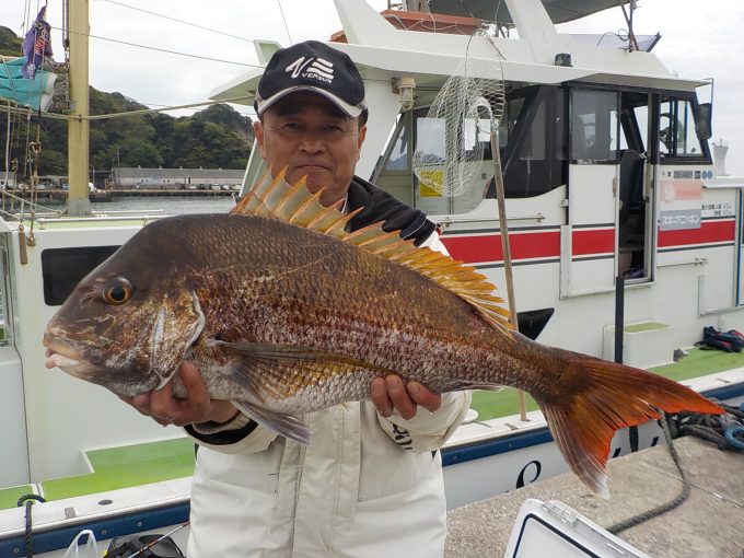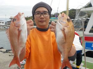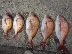 マダイ船 2017年4月21日マダイ, 釣果速報コマセ釣り, マダイ, 勝山港, 東京湾 マダイ船絶好調!!! 本日の釣果 マダイ 0.6~4.5kg 5~6匹 今日のマダイは絶好調でした。お客様2名でしたが朝からポツポツ食いがあり中盤にはダブルヒットなども見られ後半食いが止まりかけた所で大型狙いでポイントを小移動したらなんと本日最大4.5㎏のマダイをゲットできました。潮の動きさえあればまだまだ反応は見られるので今後にも期待です。 ★ライフジャケットの着用をお願いします。無い方はお貸ししますので受付の際にお申し付け下さい。★ 関連