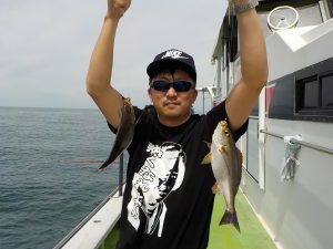 マアジ&イサキ船 2017年6月22日イサキ, 釣果速報イサキ, 勝山, 千葉県 24日は組合総会の為お休みとなります。 本日の釣果 マアジ 30~40cm 5~22匹 イサキ 22~33cm 6~17匹 前半はマアジ狙いでポツポツ当たり皆さん顔を見て、中盤からイサキ狙いに変更しました。 貸し竿の方が殆どでタナ取りに苦戦しながらもポツポツ当たり食いが落ちた後半に再度マアジ狙いに変更した所入れ食い状態になり2匹掛けや3匹掛けなどもあり納竿まで好調でした。明日はマアジ&イサキ船、スルメ船で受付中です。どちらもガラガラですので皆様のご乗船お待ちしております。 関連