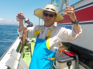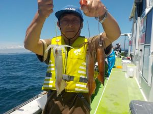 スルメイカ船 2017年7月15日スルメイカ, 釣果速報スルメイカ, 勝山港, 千葉県 明日のイサキ&マアジ船は締め切らせて頂きました。スルメ船はまだ空席があります。 本日の釣果 スルメイカ 22~40cm 10~36匹 朝の洲崎沖では反応を見つければ乗りがあるものの探索に時間がかかってしまう為今日は白浜沖へ移動しました。群れの移動が速く1回旋回が殆どでしたが乗りは良く5点掛けや6点掛けなども見られ慣れない貸竿の方もいましたが皆さんお土産を確保出来ました。 関連