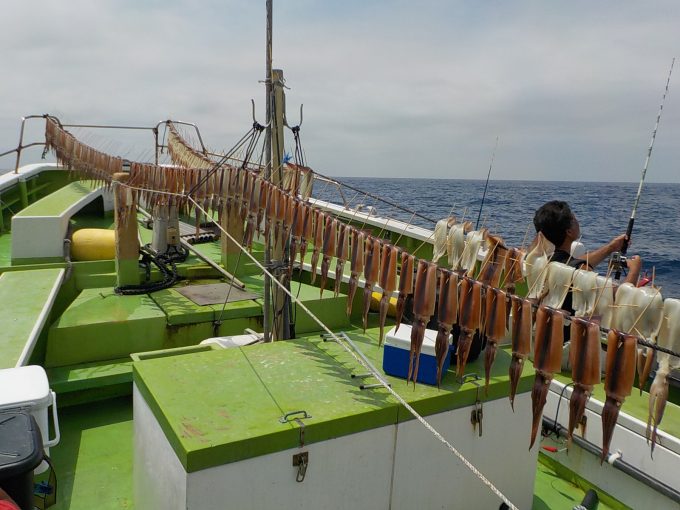 スルメイカ船 2017年8月10日スルメイカ, 釣果速報スルメイカ, 勝山港, 千葉県 明日のスルメ船は予約を締め切らせて頂きました。イサキ&マアジ船は座席に余裕がありますのでご乗船お待ちしております。イサキ&マアジ船の釣果は大船長のつぶやきで更新されますのでご覧下さい。 本日の釣果 スルメイカ 25~42cm 10~74匹 朝から乗りが順調で1流し数回出来る流しが度々あり多点掛けも見られました。後半には潮が速くなってしまいポツポツの乗りではありましたが皆さんお土産を確保出来ました。 関連