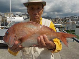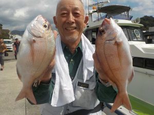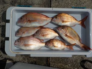 マダイ船 2017年9月25日マダイ, 釣果速報コマセ釣り, マダイ, 勝山港, 東京湾 マダイ、イナダ連日好調!!!10月1日より出船時間が6時に変更になります。10月7日は祭礼の為お休みとなります。 本日の釣果 マダイ 0.3~4.5kg 0~9匹(0は1人) イナダ1.0~1.2kg 4~17匹 今日も朝から食いが好調で前半に本日最大のマダイを含めイナダ混じりで食いが続き中盤以降もポツポツ続きマダイのオデコの方が1名出てしまいましたがその他の方は3匹以上と好釣果になれました。 関連