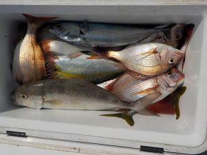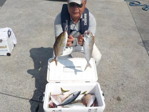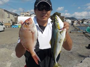 マダイ船 2017年9月27日マダイ, 釣果速報コマセ釣り, マダイ, 勝山港, 東京湾 明日は予報が悪い為出船中止とさせて頂きます。明後日からマダイ&イナダ船、ヤリイカ&スルメイカ船で受け付けますので皆様のご乗船お待ちしております。 本日の釣果 マダイ 0.3~1.4kg 1~8匹(8匹が2名7匹が1名) イナダ 1.0~1.2㎏ 3~11匹 他にカンパチ 0~2匹 朝から潮の具合が良く開始1投目からマダイのダブルヒットで始まりその後もイナダとマダイがポツポツ納竿まで食い続き皆さん楽しめました。 10月1日より出船時間が6時に変更になります。 関連