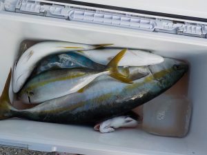 朝の勝山沖ではイナダとマダイでバリバリはないもののポツポツ当たり続け皆さん顔を見てからワラサ狙いに変更しました。ポツポツマダイの当たりに混じってワラサが当たるもバラシが多く後半に朝のポイントに戻ったところでイナダがポツポツ当たり皆さんお土産には十分な釣果となれました。