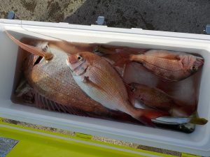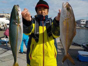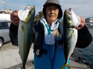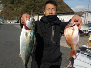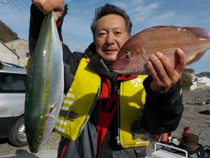 朝の勝山沖ではマダイの当たりが活発ポイント到着1投目から当たりダブルヒットなども見られワラサに変更するまでに8割の方が顔を見る事が出来ました。ワラサへ変更後はイナダの食いが優勢でダブルヒットやトリプルヒットの連続して当たる中ワラサも当たりました。後半食いが落ちた所で朝のポイントへ移動して本日最大のマダイを含めイナダ、マダイ混じりでポツポツ当たり皆さんお土産には十分な釣果となれました。
