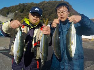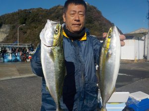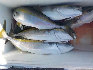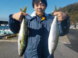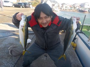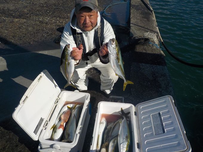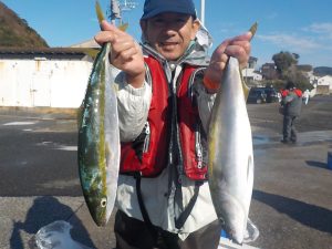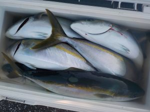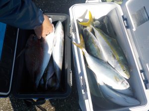 朝は勝山沖でマダイとイナダの顔を見てからワラサ狙いに変更しました。ポイント到着1投目から当たりが出てそれからが入れ食いの状態が続きダブルヒットやトリプルヒットは当たり前!手返しのいい方は食いっ放し状態が2時間以上続きました。その中でワラサも顔を出し後半には皆さん疲れてしまった様で食いがポツポツになりながらも納竿まで絶好調でした。