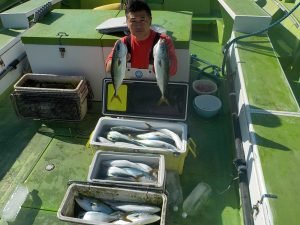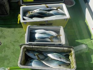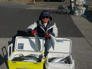 マダイ&イナダ船 2018年1月16日マダイ&ワラサ, 釣果速報イナダ, コマセ, コマセ釣り, マダイ, ワラサ, 千葉県, 東京湾 イナダ船好調!!!19日(金)と21日(日)ヤリイカ船出船となります。空いておりますので皆様のご乗船お待ちしております。 本日の釣果 マダイ 0.4~1.2㎏ 0~1匹 イナダ 1.0~1.8kg 14~50匹 他にクロダイなど 本日スポニチ取材で阪本智子さん乗船してくださいました。朝は勝山沖でマダイの顔を見てから久里浜沖へ移動しました。前半はポツポツと当たり中盤から徐々に当たりが良くなり始め後半には入れ食い状態と尻上がりに食いが活発になり中には3匹掛けなどもあり絶好調でした。 関連