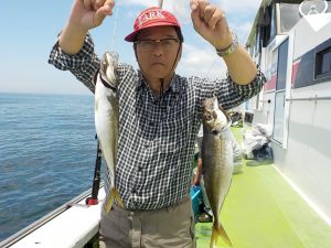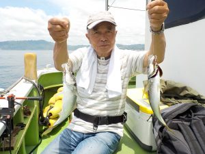 マアジ船 2018年6月7日マアジ, 釣果速報コマセ, マアジ, 勝山港, 千葉県 特大14㎏ブリも!! 本日の釣果 マアジ 25~42cm 14~26匹 朝からマアジの食いは良く開始1時間ほどで皆さんお土産を確保出来ました。その後イサキを狙うも食いが悪く暫く粘りましたが後半マアジに切り替え大型主体の食いが良く好調でした。アジ餌で14㎏の特大ブリもあがりました。 関連