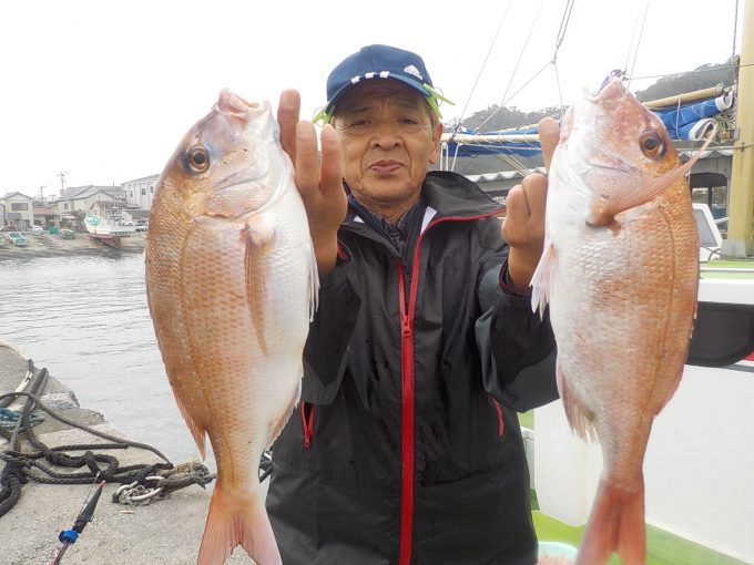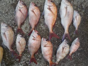 朝は勝山沖でマダイを狙い皆さん顔を見てから久里浜沖へ移動しました。到着して間もなくワラサが当たりその後も反応が出ると当たり全員顔を見る事が出来ました。後半はマダイ狙いに変更したところこれが当たりダブルヒットや連続ヒットが続き皆さんお土産には十分な釣果となれました。