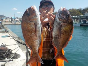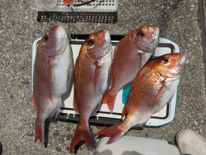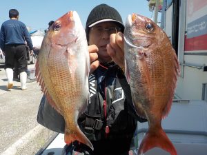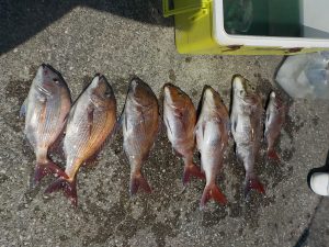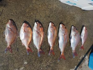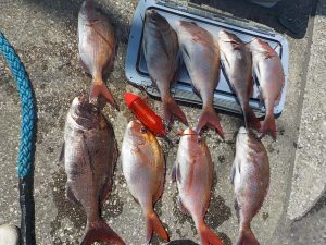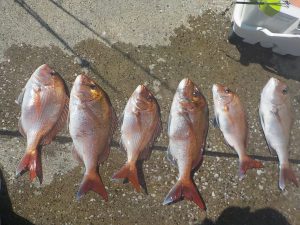 マダイ船 2020年4月2日マダイ, 釣果速報コマセ釣り, マダイ, 勝山港, 東京湾 マダイ爆釣!!!明日はヤリイカ船とマダイ船で出船確定しております。ヤリイカ船は空いておりますので皆様のご乗船お待ちしております。 本日の釣果 マダイ 0.6~2.8kg 4~9匹 マダイ爆釣でした!!!朝の1投目から5人同時ヒットのロケットスタートでその後もダブルヒットやトリプルヒットが続き開始1時間ほどで全員顔を見ることが出来ていい人は5匹上げていました。中盤から後半にかけてもポツポツながら当たりが出てお客様7人で9匹、8匹、7匹が3人、6匹、4匹で計48匹と絶好調な1日となれました。 関連